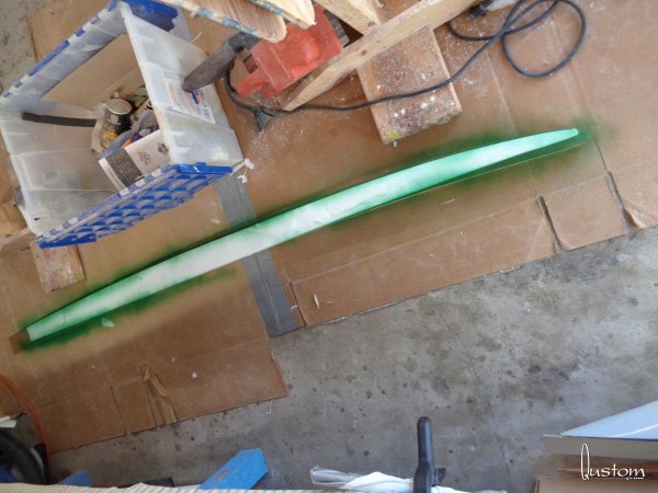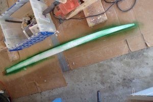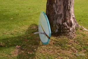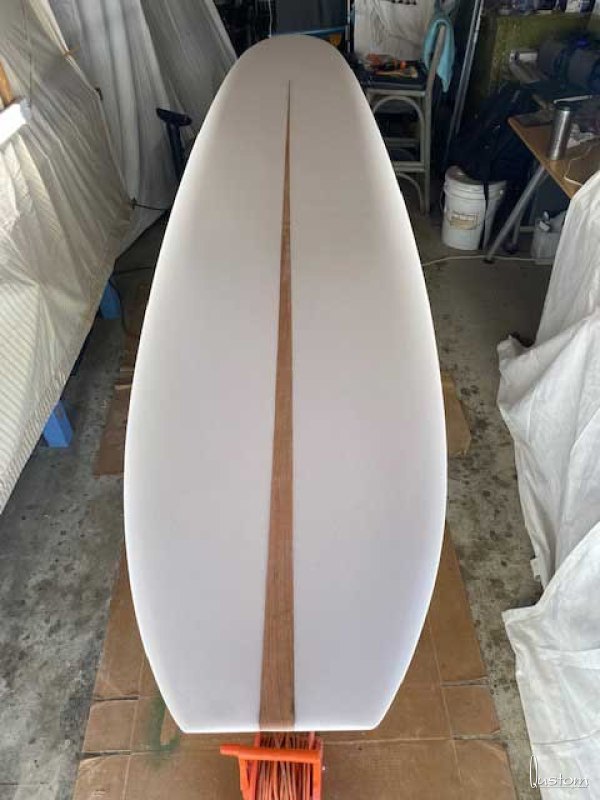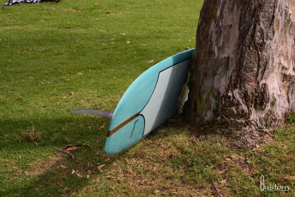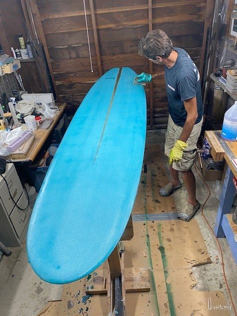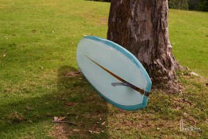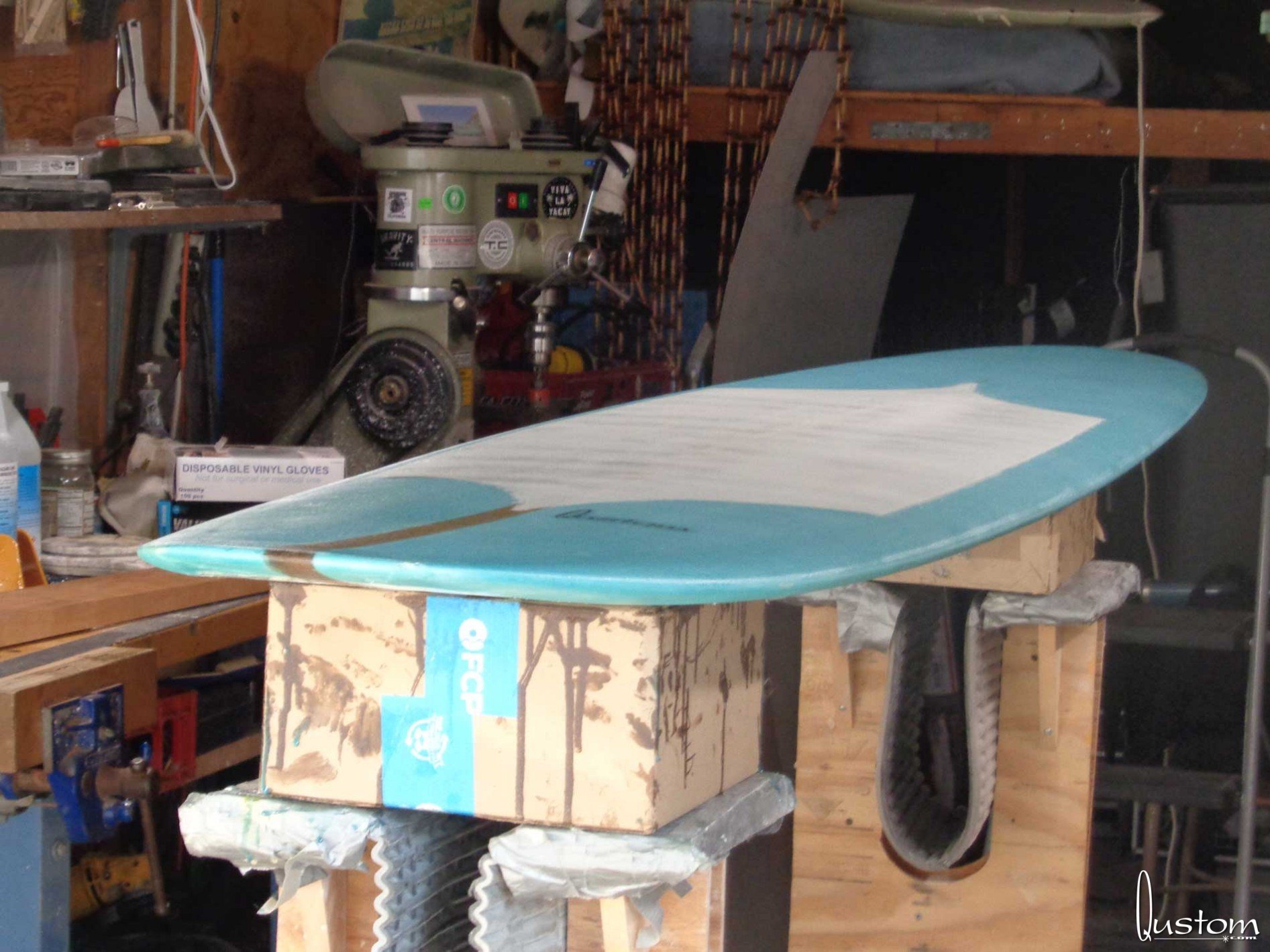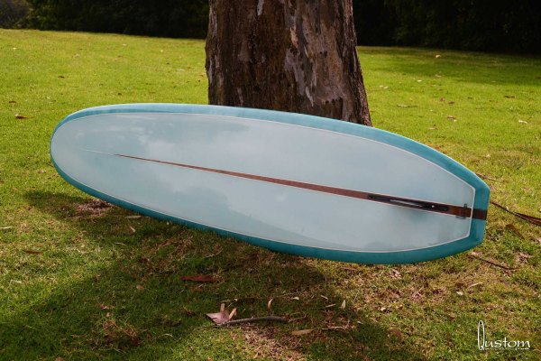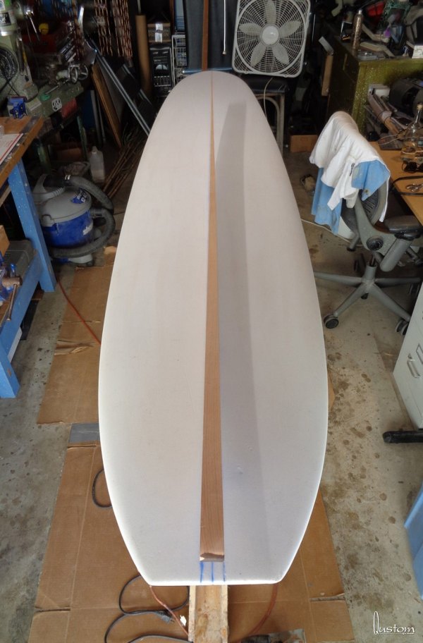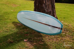 I was hoping to glass the board with Volan, but there was none available in town on short notice and I was trying to finish the board before a contest at Malibu. So I went with standard 8 oz. glass and tried to tint the resin to simulate the look of Volan. A dab of green, a dab of blue, and a dab of black, and I had the exact color I wanted... NOT! It came out waaaay darker than I wanted, so I just reduced it 50% and went for it. And now that it's done, the color is one of the first things people comment on when they see the board.