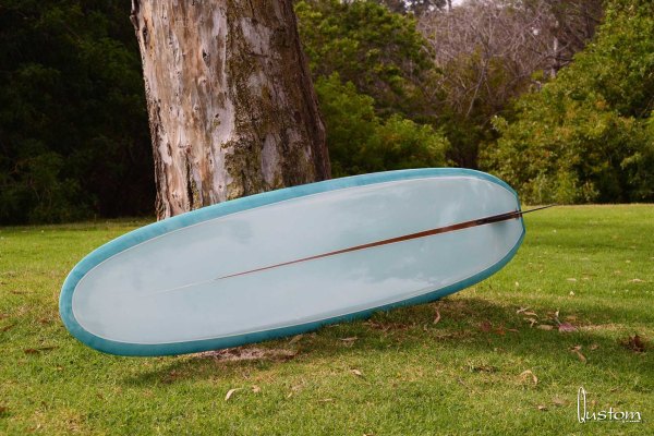This board began as an idea to replicate the tail of a 9'4" Steve Seebold shaped noserider that I had acquired a few years back, only in a lighter and more maneuverable 9'0" length. That board had been shaped backwards with reverse rocker and loads of kick in the tail. I loved how flickable it was when you stepped back, even though it was a fairly beefy noserider with a wide nose and lots of concave.