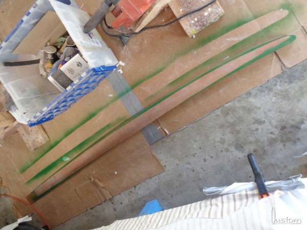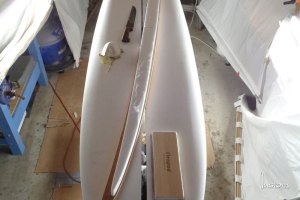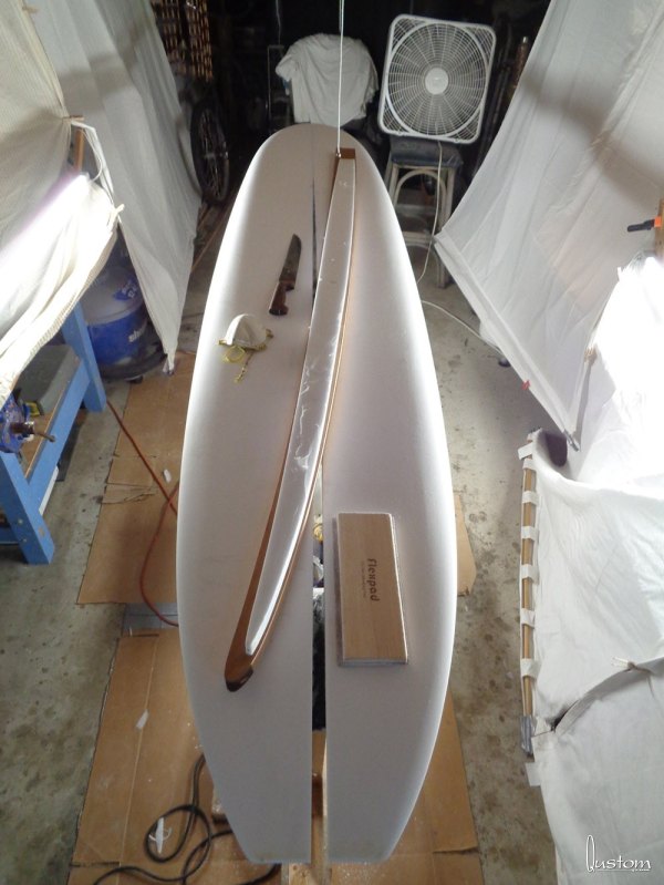 The deck is another story though... I made the mistake of doing a white deck patch over the first lamination, and the white resin bled under the tape and through the rough cloth like a mother... duh! Hence the need for that big fat navy blue pinline to hide that ugliness. After doing the white pinlines on the bottom I wish I had done the top ones white too. For that matter, I wish I hadn't done the deck patch in white in the first place - it would have shown off the stringer better. Oh well.