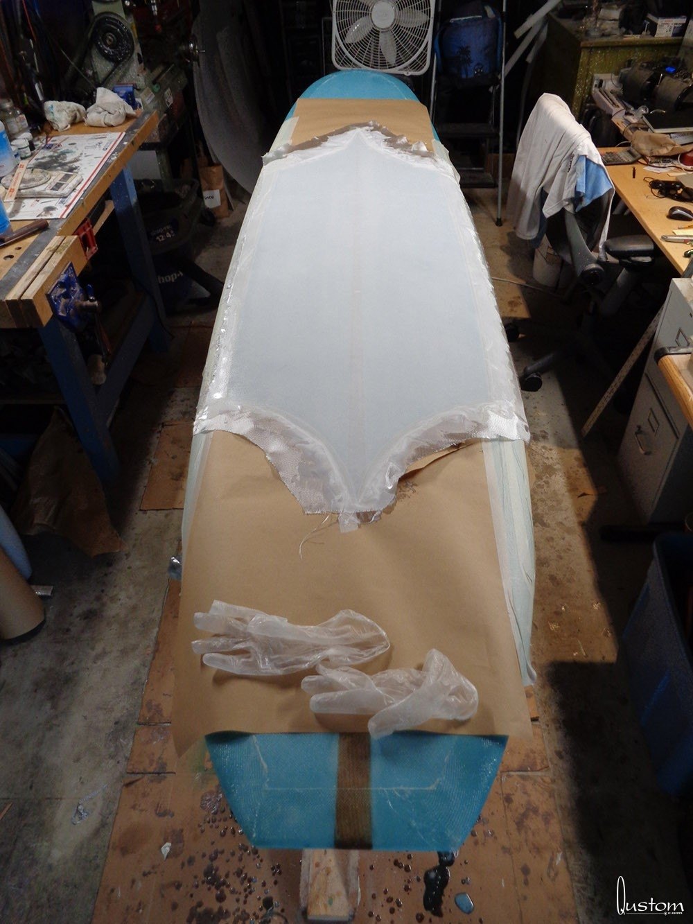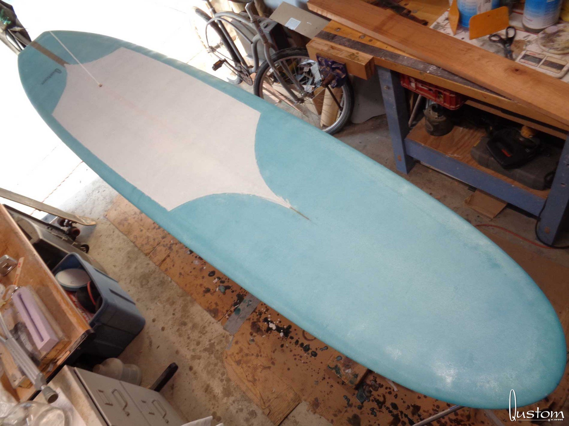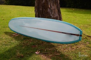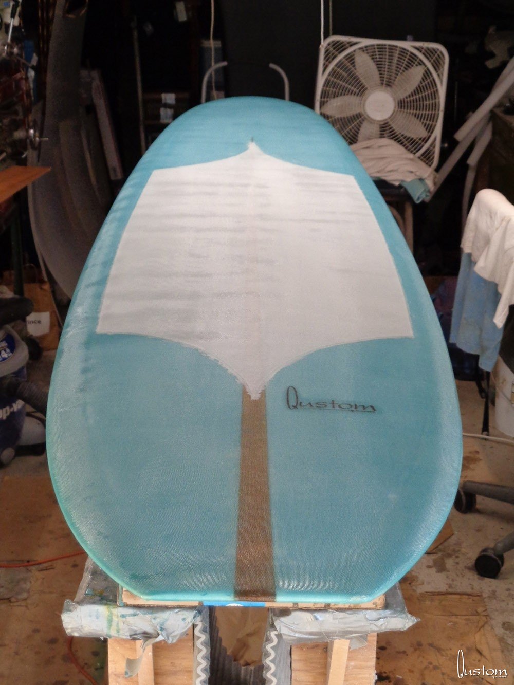 I was hoping to glass the board with Volan, but there was none available in town on short notice and I was trying to finish the board before a contest at Malibu. So I went with standard 8 oz. glass and tried to tint the resin to simulate the look of Volan. A dab of green, a dab of blue, and a dab of black, and I had the exact color I wanted... NOT! It came out waaaay darker than I wanted, so I just reduced it 50% and went for it. And now that it's done, the color is one of the first things people comment on when they see the board.