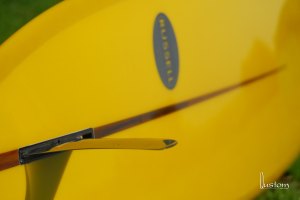 When you really bury the rail and get the bottom of the board into the wave, you are now using that little extra bit of rocker that can found starting about 3" inboard of the rail, but when you get back in trim that flatter knife edged rail really holds, and she flies down the line like a missle! I also believe that with the foiled out stringerless nose there is quite a bit of flex available to increase the effective rocker in hard bottom turns.
