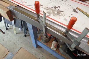 The stringer was a joint project between myself and my good friend Shawn "Chuk" Woolery of San Diego Sash Company. It's cherry wood I sourced from TH&H in Clairemont Mesa, and Chuk helped me rough it out at his shop. Ripping a 6" deep cut on a diagonal down an 8' long board is not for the faint of heart, but Chuk's mastery with large equipment made it all happen. He wouldn't be entrusted by the likes of the Hotel Del Coronado if he didn't know what he was doing.