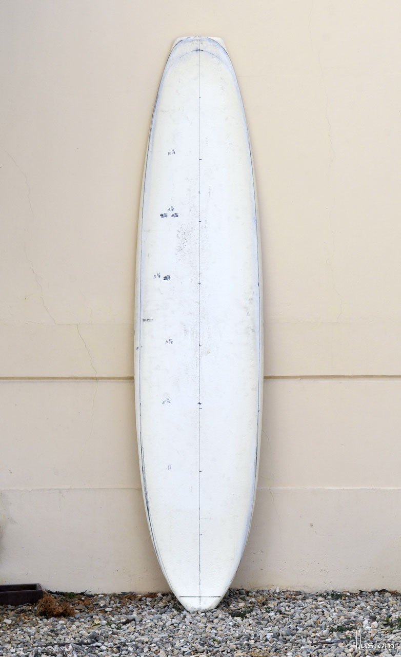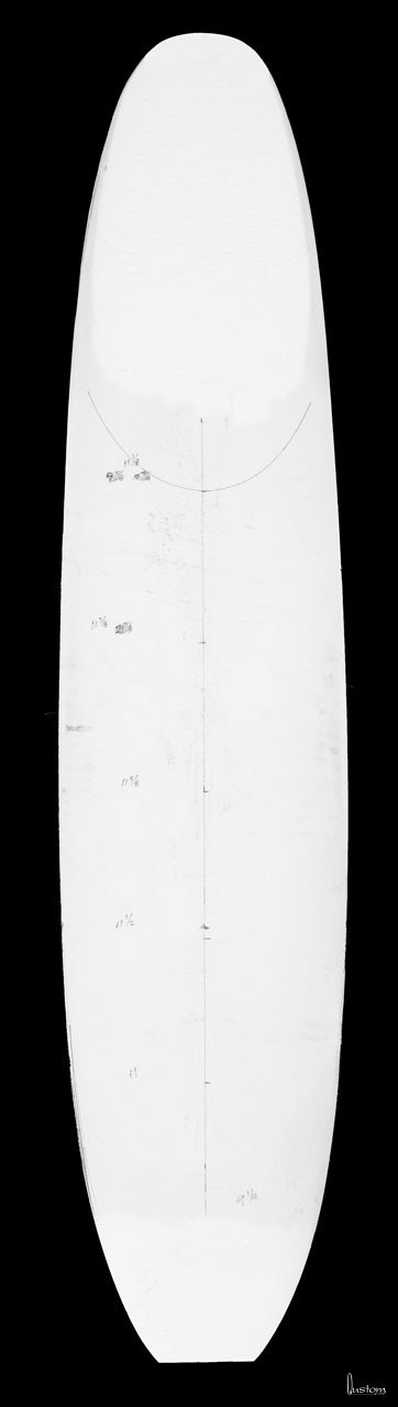 This board began as an idea to replicate the tail of a 9'4" Steve Seebold shaped noserider that I had acquired a few years back, only in a lighter and more maneuverable 9'0" length. That board had been shaped backwards with reverse rocker and loads of kick in the tail. I loved how flickable it was when you stepped back, even though it was a fairly beefy noserider with a wide nose and lots of concave.